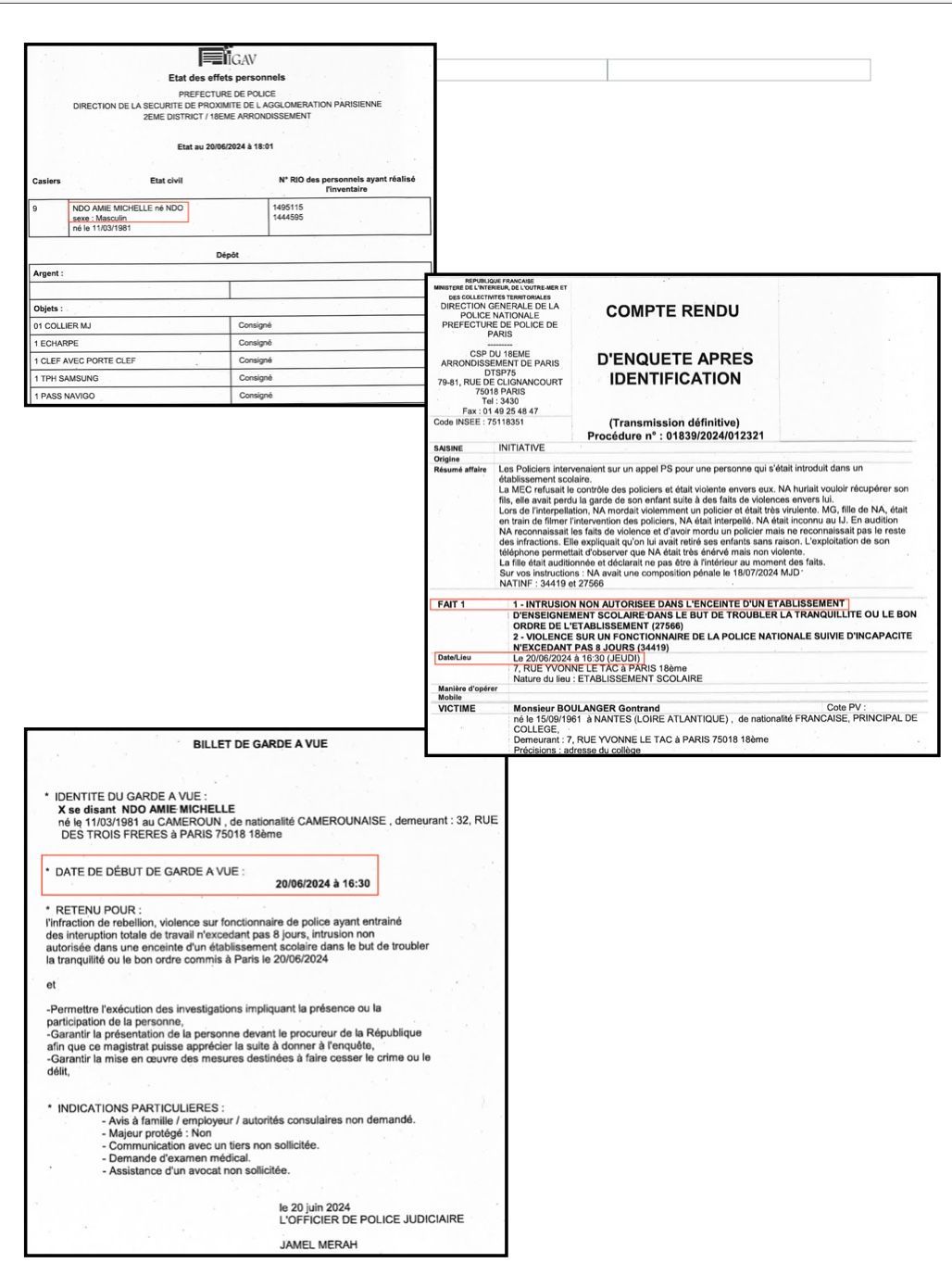 J’ai été appelée par le commissariat de la Goutte d’Or - 34 Rue de la Goutte d’or - Paris 18 qui m’a annoncé que mon fils était dans leurs locaux. Un OPJ avait déjà pris la déposition de mon fils Richi, mineur, sans qu’un adulte ou un avocat soient présents à ses côtés.